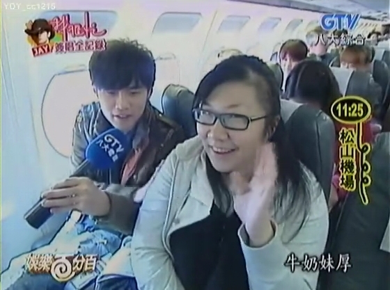 早速、空港の搭乗口からマイクを片手に機内に乗り込む